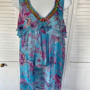 Beautiful, sheer, colorful, top/swimsuit cover up with beaded collar