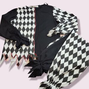 Charming scarecrow outfit with black dress and orange patches. Includes hat with yellow flower. Perfect for Halloween fun.