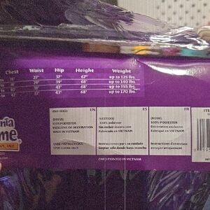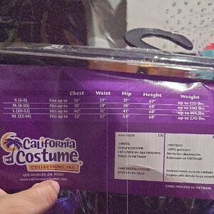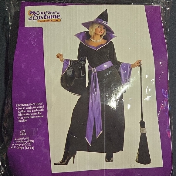 Mystical sorceress costume in vibrant purple and black. Includes dress with collar and sash. Ideal for Halloween magic.