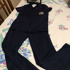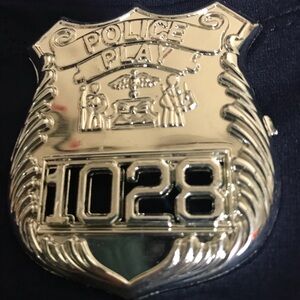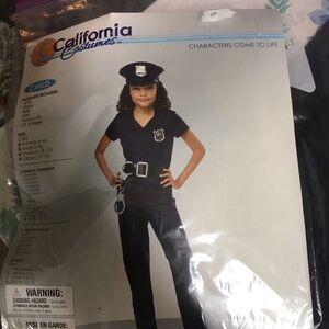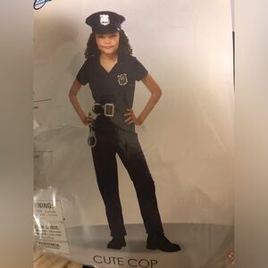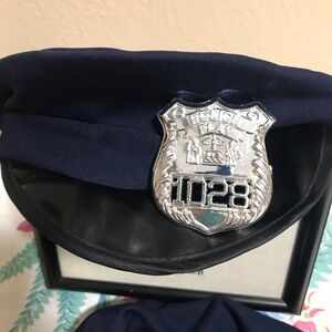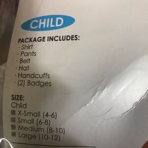Transform into a confident police officer. Includes navy shirt and navy pants, hat and 2 badges. NO BELT OR HANDCUFFS. Ideal for Halloween fun. Gently used.