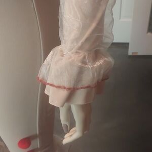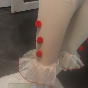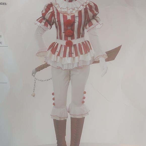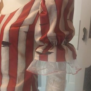 Sadistic clown outfit with bold red and white stripes. Features ruffled details and pom-pom accents. Missing the neck collar and skirt. Ideal for Halloween fun.