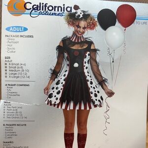 Fun clown dress with polka dots. Includes hat and collar. Perfect for Halloween.