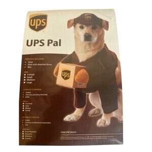 • Your reliable canine courier is here. The UPS Pal dog costume includes shirt with a stuffed front and attached arms, a box and a cap. Box is attached with Velcro to the arms. Box must be cut out from sheet and assembled.