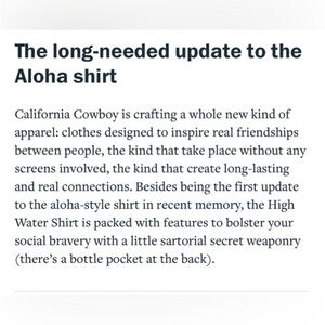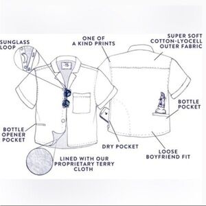 “Vintage inspired, California born and made. A new breed of aloha shirt seriously dedicated to the game: you decide which. It's armed to the teeth, ready to cover up poolside, backyard kiddie pool-side, at ease wherever the score takes us. Dedicated sunglasses loop, dry pocket, and (wait for it) drink pocket/bottle opener combo. Silky lyocell blend brings a bold pop to a secret and cozy terry interior. Boxy, cropped fit with functional button front. Fully lined. By California Cowboy. XS(2), S(4-6), M(8-10), L(10-12), XL(14).