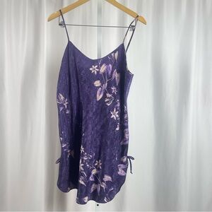 This chic chemise showcases a rich purple color and floral print. Made from a lightweight fabric, it drapes beautifully for a relaxed fit, ideal for intimate wear or sleepwear. The delicate spaghetti straps enhance its elegant and flowy silhouette. Side tie bow slits. Excellent condition!