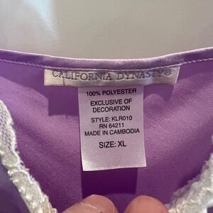 Keywords: satin slip, lingerie, nightgown, sleepwear, purple dress, lace trim, adjustable straps, California Dynasty, XL, plus size, negligee, nightie, satin nightgown, flower detail