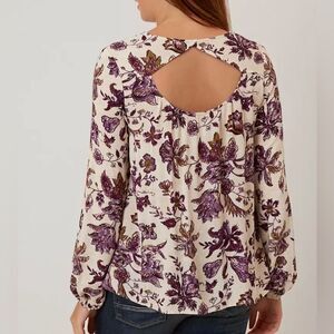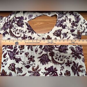 Long sleeves, V-neck, and open back, Elasticized cuffs.A beautiful array of flowers on a cream backdrop.