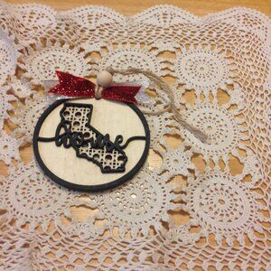 New holiday ornament in the shape of the state of California. Says "home" across it. Festive red and silver bow and burlap twine hang tag.