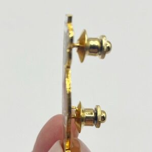 In excellent pre-owned vintage condition with very minor scratches to enamel. Just under 2” tall Brown Bear in Red Suit. Double pin back.