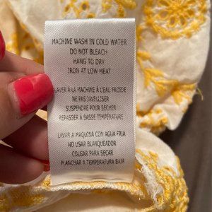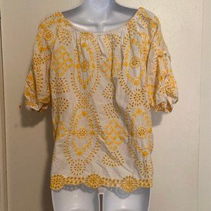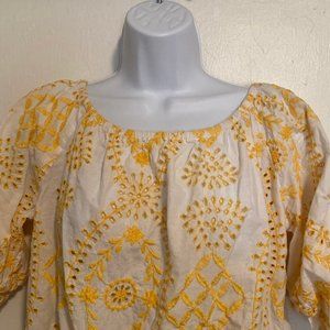 Size M. White cotton blouse with yellow embroidered design. Elastic neckline that can be worn off the shoulder. Short sleeves are elastic. Stretchy or slouch fit, like a peasant or boho style. Waistline ties. GUC. No rips, stains or defects known.