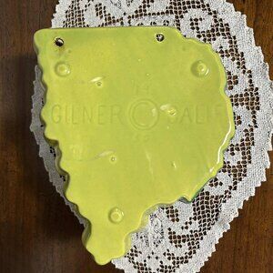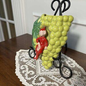 MCM Gilner 1950 ceramic red pixie elf grape wall pocket vase with chips in the red glaze. His face is a bit faded and the cute little guy also stubbed his toe. No wrath on these grapes as they are succulent. 8” x 6.5” x 3”. Can’t get more mid century than this.