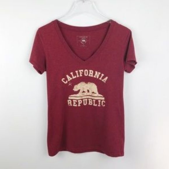California Republic short sleeve bear graphic v-neck t-shirt in a size large. This top features a faded California bear graphic on the front center, the top is a burgundy red color with a cream graphic. Made with 60% cotton and 40% polyester, machine washable. Approximate measurements laying flat: armpit to armpit: 17", length: 24". Professional seller, ships same or next day. C1-C180.