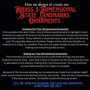 Lightweight Brass Ornament measures 2.25 x 2.75 inches, .3mm thin and is hand twisted slightly to give a 2D effect when hanging on your Christmas tree. Part of our State & City Landmarks Series - find all your favorite places to add to or start your own meaningful collection!