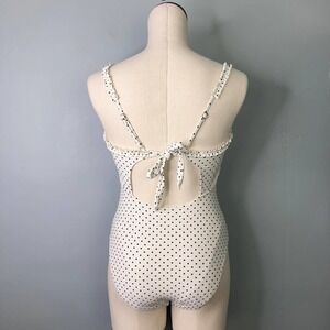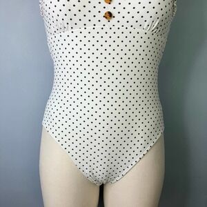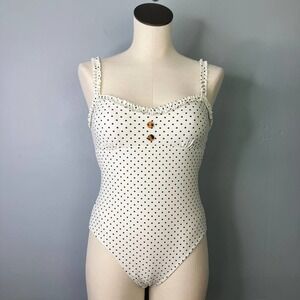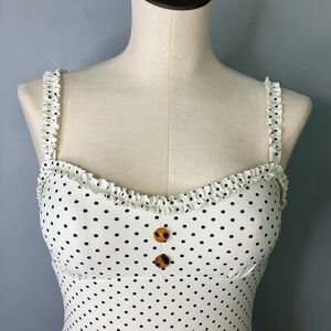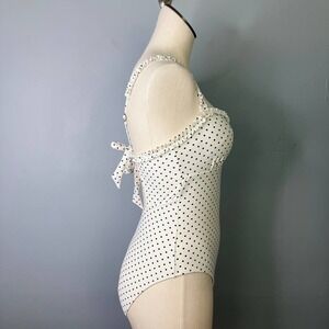 California Sunshine Ivory Pin Dot Ruffle Trim One Piece Swimsuit Junors' Size M. Ivory bathing suit with black polka dots. Mini ruffle trim along the sweetheart neckline and front of shoulder straps. Button trim at center front bust. Self-tie closure center back, adjustable shoulder straps. Cutout in back.