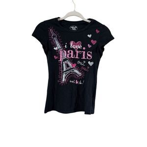 California Talks girls' Y2K short-sleeve T-shirt, size large. Paris theme. Black and pink. 100% cotton. Excellent condition with no issues. D90