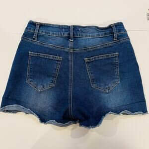 These are California Vintage Denim Shorts for Juniors in size 9. They are blue jean with a low rise, distressed, and cuffed style, perfect for casual or travel occasions. The shorts feature a 5-pocket design with a 3-inch inseam and a medium fabric wash. They have a regular fit with a 26-inch waist size and are easy care, machine washable. Ideal for summer, fall, and spring activities like walking or at the beach.