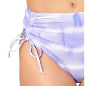 California Waves Tie-Dyed High-Waist Bikini Bottoms. Pull on. High waist. Sits at belly button. Moderate bottom coverage. Cinch drawstring tie details at sides. Lined. Shell material: 82% nylon 18% spandex. Lining material: 100% polyester. Purple and white tie dye pattern all over.