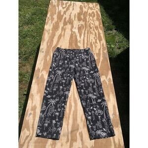 California style black & white pants size 10. Preowned good condition. Has a tropical print on it- includes Palm trees, shopping, out for drinks, beach umbrellas l; Riding a bike & more. Real cute for summer! 94% polyester 6% spandex. 16 in waist, 35 in hem, 25 in inseam. Ships in 1-4 days 🌏