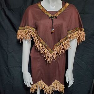 Includes brown dress with fringe at the bottom and brown poncho with fringe at the bottom.