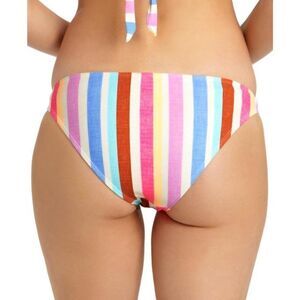 Textured stripes in a rainbow of colors bring a fun look to these California Waves bikini bottoms. Rings accent the sides of the hipster silhouette.