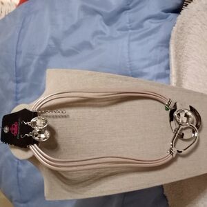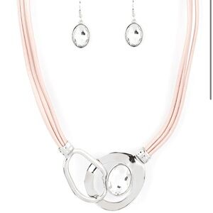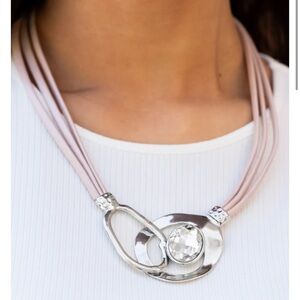Attached to shimmery strands of pink leather, a pair of oversized and warped silver links delicately overlaps into a contemporary centerpiece below the collar. An exaggerated white gem asymmetrically embellishes the silvery accent piece, adding unexpected elegance to the modern design. Features an adjustable clasp closure.