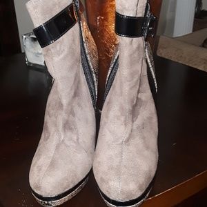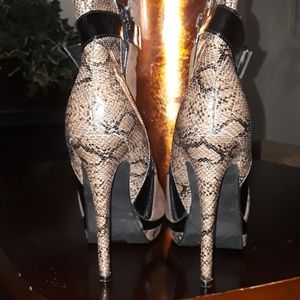 Call It Spring. Features a faux suede and contrasting faux snakeskin upper. Side zip with contrasting ankle strap. The stiletto heel measures 5" with a 1" platform.