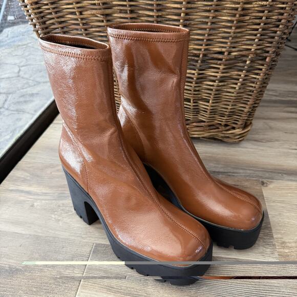 Bold and stylish — these Call It Spring ankle boots feature a glossy brown faux leather upper, chunky platform heel, and rugged black lug sole. The slip-on stretch shaft makes them easy to wear while giving a sleek, modern edge. Perfect for fall looks, nights out, and statement outfits.