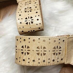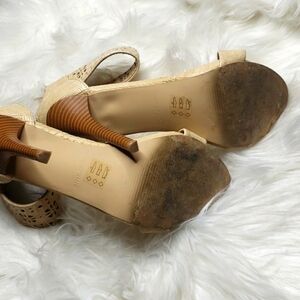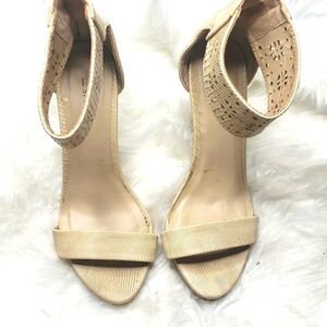 reptile embossed. Cutout ankle strap. back zip. Wooden stiletto heel.