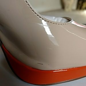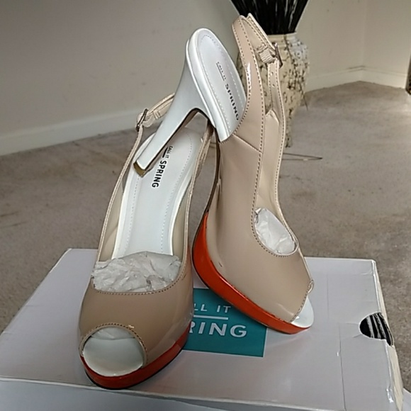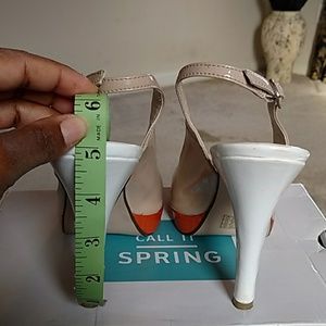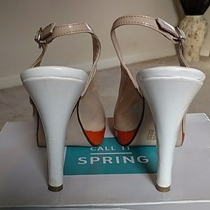 Call It Spring sling back platform high heel patent leather shoe. Tan white and orange. Easy to walk in. Has some wear in good condition. NO box.