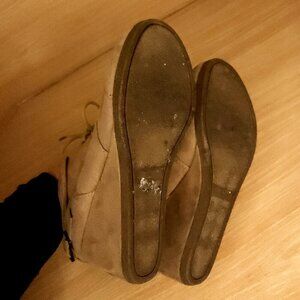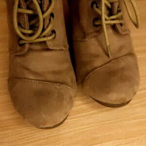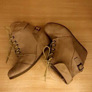 Call It Spring tan lace up faux suede wedge boots 7. Gently used condition, there is some wear on the toe and heel.