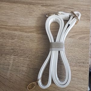 Faux Leather, white & navy blue. Holds its shape. Can be converted to crossbody. Used once, like new. Please ask for more pictures if needed.