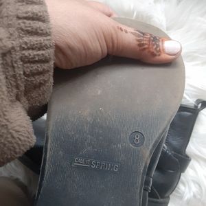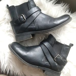 Black moto booties with buckles and elastic stretch banding. Minor scuffs as pictured but in overall great gently pre worn condition. Size 8.