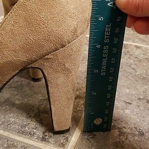 The heel is just shy of 5 inches. They are a suede material. Outside of left shoe has a little discoloration (darkness) so I'm not sure what happened.