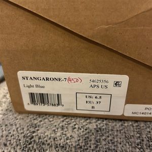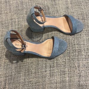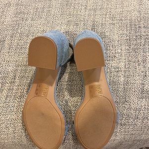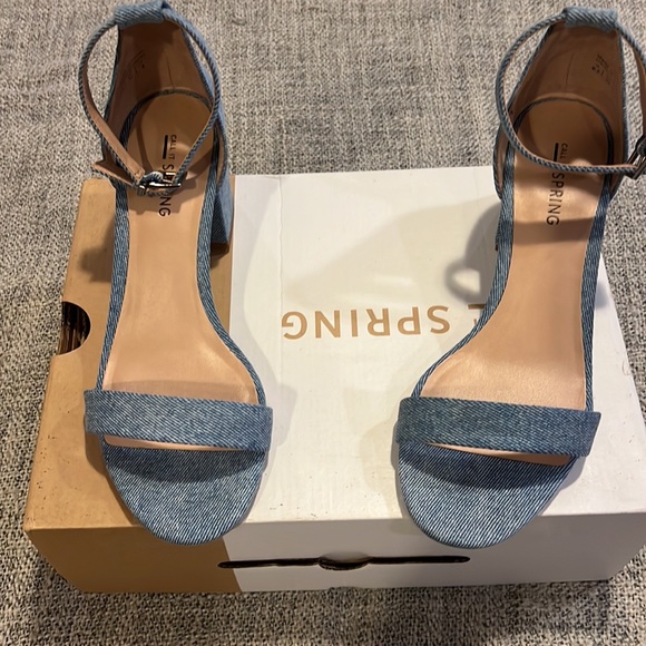 This is a light blue jean colored Call it Spring Stangarone ankle strap dress sandal. The shoe is made in Vietnam and it has a soft feel. It has a block heel that is approximately 2.25 inches high. Brand new with a box – Size 6 1/2.