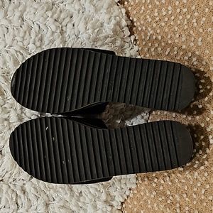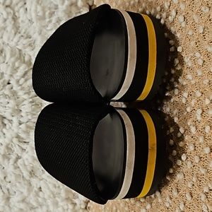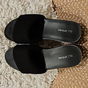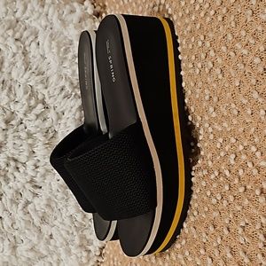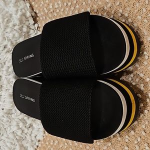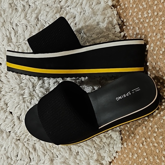 Call it Spring Larelasien Plarform Slide Sandals size 9, black/white/yellow platform, cushioned Waffle like wide slide top in black, 2.5" heel, gently worn once in excellent condition see all photos for details!
