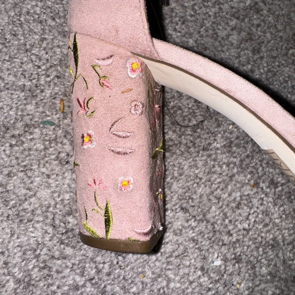 Floral designs on the heels. Very cute just time for spring and summer. Excellent condition never worn. Light pink. The first picture is the true color.