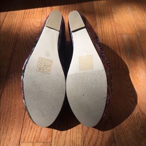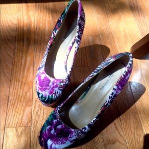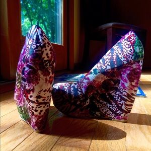 Gorgeous floral/zebra print wedges! Bold print, bright colors. 5" heel, 1-3/4" platform, satin finish fabric, excellent condition, worn once. Any questions, feel free to ask! 🌻