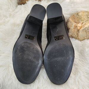 Black vegan leather block heel round toe pumps. Preloved condition. All sections of interest as well any known flaws have been documented in the photos and noted as thoroughly as possible. if there are no known flaws, none will be noted. Please feel free to ask any questions before purchase 🙂.