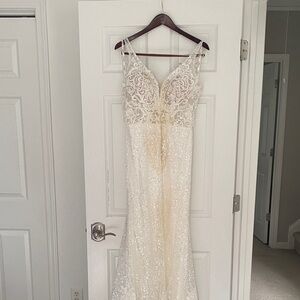 Altered to add thicker straps with Calla Blanche Bethany extra material, built in bra and bustle, and took in the dress around the waist and thighs. Bottom of the dress has staining from walking, however, if you are shortening the dress this will alleviate the problem. I am 5'9 and wore the dress with heels. Small blemish on front that would come out with another cleaning (see picture).