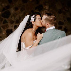 Beautiful off the shoulder mermaid wedding dress with floral lace and a matching cathedral veil. Ivory with nude undertones, size 12.