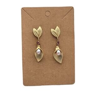 Elegant and timeless, these unmarked drop earrings feature a beautiful calla lily floral design with a lustrous faux pearl nestled inside each bloom. The textured gold-tone leaves add a graceful touch, accented by tiny berry-red beads for extra charm.