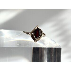 Gorgeous sterling silver garnet gemstone vintage ring. The center stone is marquise cut and held in 2 prongs. The head looks like it's the shape of a calla lily. Marked as sterling and tested positive as such. Shank is subtley bypass style. Very pretty and unusual ring.
