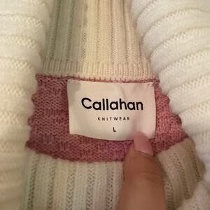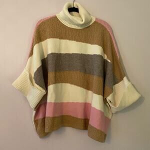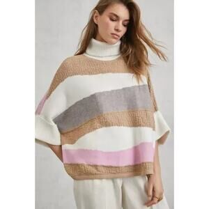 Callahan Anthropologie Women's size Large Pink Striped Short Sleeve Turtleneck Sweater. Callahan brand women's oversized fit sweater in a size large. Brand sold at Anthropologie. Pink, cream, gray, brown striped. Turtleneck neckline. Soft fabric. Measurements as pictured. In great pre-owned condition, see photos for more details. Always feel free to ask any questions you may have! Reasonable offers accepted.