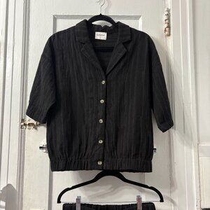 Letting go of this set due to being gifted something similar. Very comfy (elastic waistbands on top and pants!) and stylish with the textured stripes. Top is a medium and bottoms are size large. Fit like US size 6 for top and US 8 for bottoms.
