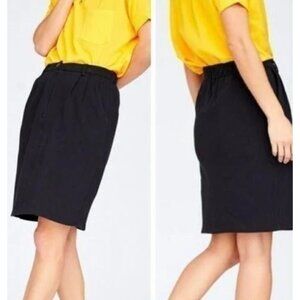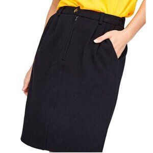This refined pencil skirt blends everyday comfort with a polished aesthetic, making it an essential piece for both workwear and casual styling. Designed in a soft knit fabric, it offers ease of movement while keeping its structured silhouette. The high-waisted fit creates a flattering shape, further enhanced by belt loops that allow for accessorizing and personal touches. A tortoiseshell button detail lends subtle sophistication, balancing function with timeless appeal. Its knee-length cut keeps the look modest yet modern, pairing versatility with classic style. With its understated elegance, this skirt connects to normcore, workwear chic, minimalist, and timeless aesthetics, reflecting effortless adaptability across seasons.