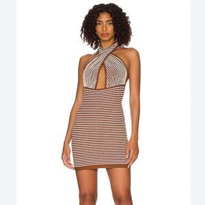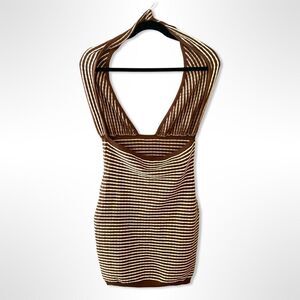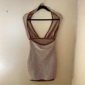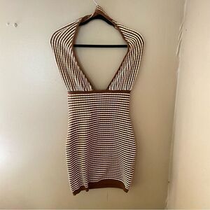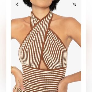 Callahan mimi Brown and cream, striped knit mini dress with crisscross front and halter style neck open back. Lots of stretch