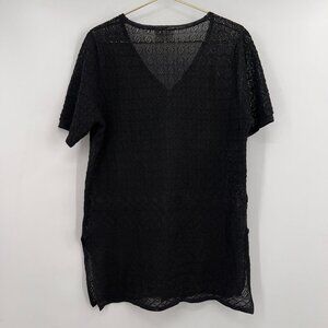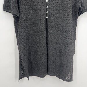 Chic and effortless, this Callahan black crochet knit tunic features a flattering V-neckline, front button closure, and short sleeves. Crafted with intricate openwork crochet, it offers a breezy, relaxed silhouette—perfect for layering over a tank or swimsuit. Side slits add movement and style, while the soft knit ensures comfort. Size XXL.