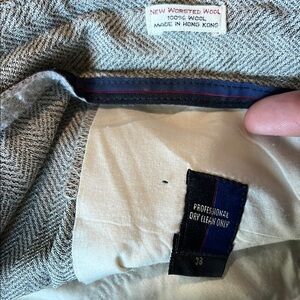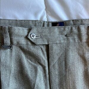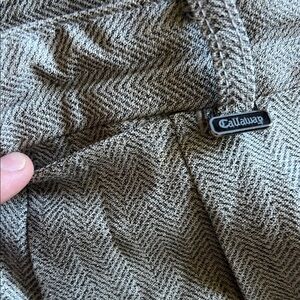 Callaway's wool golf pants 38x30 are crafted with a pleated front and a wide leg silhouette, offering a sophisticated and timeless look. These vintage wool golf pants have a watch pocket, perfect for holding your ball marker, divot or.. pocket watch, as well as two deep front packets and 2 back pockets. Made from lightweight herringbone patterned worsted wool fabric, these pants are ideal for all weather as wool is naturally temperature regulating. In EUC Front does have small snag (see photo) and back has one pinhole in the bottom leg area (see photo) and one tiny hole near the belt loop (see photo).