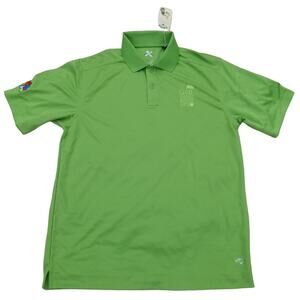 Bright lime green golfing polo shirt w/ short sleeves, collar, 2 button placket. High tech fabric: X Series dry, antimicrobial, moisture wicking, wrinkle resistant, UPF 15+ sun protection. Golf Classic logo embroidery on front left chest, peacock on right sleeve. New, with tags. Size Large by Callaway. Color: Kiwi