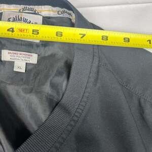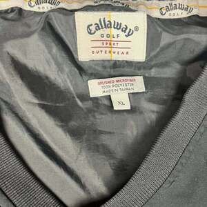 Callaway Golf Sport Outerwear Jacket, size XL, in brushed microfiber black. This jacket is perfect for golfing or casual wear, offering comfort and style. It features a full zip-front closure and two front pockets. Made from 100% polyester, it's lightweight and easy to care for (machine wash cold, tumble dry low). Good pre-owned condition with some minor wear noted on the back of the jacket (see image).